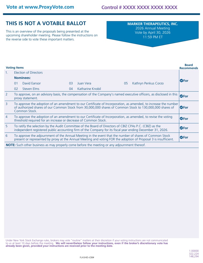 ![]() | Voting Items Board Recommends THIS IS NOT A VOTABLE BALLOT This is an overview of the proposals being presented at the upcoming shareholder meeting. Please follow the instructions on the reverse side to vote these important matters. Vote at www.ProxyVote.com FLASHID-JOB# Control # XXXX XXXX XXXX XXXX 1.00000 322,224 148,294 Under New York Stock Exchange rules, brokers may vote “routine” matters at their discretion if your voting instructions are not communicated to us at least 10 days before the meeting. We will nevertheless follow your instructions, even if the broker’s discretionary vote has already been given, provided your instructions are received prior to the meeting date. MARKER THERAPEUTICS, INC. 2026 Annual Meeting Vote by April 30, 2026 11:59 PM ET 1. Election of Directors Nominees: 01 David Eansor 03 Juan Vera 05 Kathryn Penkus Corzo 02 Steven Elms 04 Katharine Knobil For 2 To approve, on an advisory basis, the compensation of the Company's named executive officers, as disclosed in this proxy statement. For 3 To approve the adoption of an amendment to our Certificate of Incorporation, as amended, to increase the number of authorized shares of our Common Stock from 30,000,000 shares of Common Stock to 130,000,000 shares of Common Stock. For 4 To approve the adoption of an amendment to our Certificate of Incorporation, as amended, to revise the voting threshold required for an increase or decrease of Common Stock. For 5 To ratify the selection by the Audit Committee of the Board of Directors of CBIZ CPAs P.C. (CBIZ) as the independent registered public accounting firm of the Company for its fiscal year ending December 31, 2026. For 6 To approve the adjournment of the Annual Meeting in the event that the number of shares of Common Stock present or represented by proxy at the Annual Meeting and voting FOR the adoption of Proposal 3 is insufficient. For NOTE: Such other business as may properly come before the meeting or any adjournment thereof. |